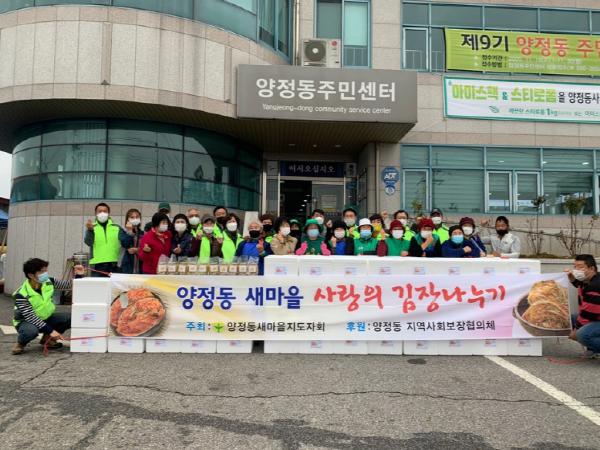 김주수 양정동장은 “행사를 위해 수고를 아끼지 않은 새마을부녀회 회원 모두에게 깊은 감사를 전하고, 코로나19 장기화와 사회적 거리두기로 소원해지기 쉬운 이웃 돌봄의 실천이 이번 김장나눔 행사를 계기로 더욱 활발해지길 바란다”고 전했다.