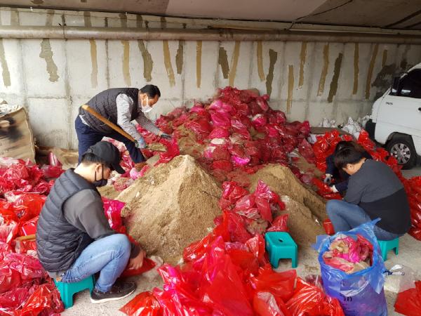 [KNT한국뉴스타임] 남양주시 퇴계원읍(읍장 김동운)은 지난 18일 퇴계원 사거리 교각 밑에서 직원 및 안전지킴이 회원 10여 명과 함께 겨울철 강설로 인한 각종 안전사고 예방을 위해 염화칼슘과 모래를 혼합한 제설용 모래주머니 2천여 개를 제작했다.