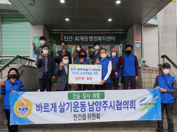 [KNT한국뉴스타임] 남양주시 진건읍 바르게살기협의회(위원회장 조상희)는 19일 관내 취약계층을 위한 나눔활동에 힘을 보태고자 서부희망케어센터에 후원금 50만원을 전달하였다.