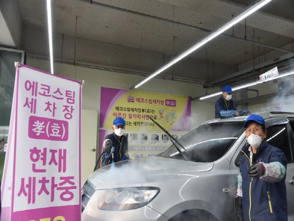 용인시처인노인복지관(김기태 관장) 부설 시니어클럽에서는 매주 월요일부터 금요일까지 용인시청 지하 1층 주차장 내에 ‘에코스팀세차장 孝(효)’를 운영하고 있다.