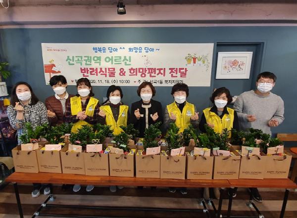 [KNT한국뉴스타임] 의정부시 신곡1동 복지지원과는 11월 18일‘행복 담아드리기’행사를 개최해 코로나-19로 인해 외부 활동이 어렵고 정서적 단절을 겪고 있는 신곡권역 내 24명의 어르신들께 반려식물과 희망 편지를 전달했다고 밝혔다.