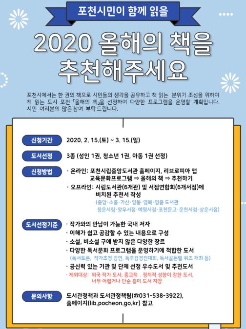 [KNT한국뉴스타임] 포천시립도서관에서는 한 권의 책으로 시민들의 생각을 공유할 수 있는 포천시민이 함께 읽을「2020 올해의 책」후보도서를 3월 15일까지 시민들로부터 추천받는다.