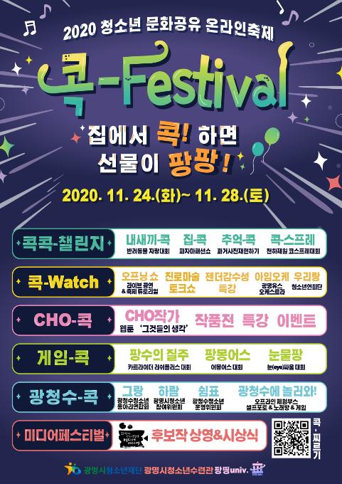 [콕-Festival]은 축제 전용 온라인 공간(홈페이지)을 구축하여 ▷자율게시판을 통한 주민참여형 체험부스 <콕콕-챌린지> ▷날짜 별 각종 공연과 특강 <콕-Watch> ▷카트라이더, 어몽어스, 눈싸움 게임대회 <게임-콕> ▷청소년자치기구 온·오프라인 체험부스 <광청수-콕> 등 청소년과 지역사회가 함께 참여할 수 있는 다채로운 활동 및 프로그램이 진행될 예정이다.