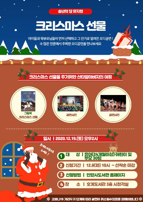 어린이를 위한 문화공연으로는 뮤지컬 ‘미녀와 야수’(5일), 책과 마술을 결합한 ‘미리 크리스마스 매직 쇼’(12일) 등 두 개의 프로그램을 유튜브를 통해 실시간으로 제공된다.