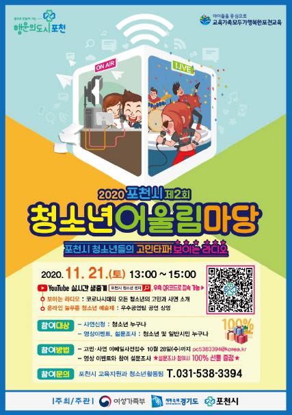 [KNT한국뉴스타임] 포천시는 오는 20일부터 포천시 청소년센터 유튜브 채널을 통해 비대면 ‘2020년 포천시 청소년어울림마당’을 개최한다고 밝혔다.