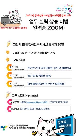 ‘알려줌(zoom)’ 프로그램의 수강을 원하는 고양시 장애인 복지시설 종사자는 이메일(sunggyung@korea.kr) 또는 전화(031-8075-3651)로 신청하면 된다.