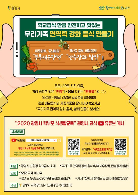 [KNT한국뉴스타임] 광명시는 코로나19로 대면 교육이 어려움에 따라 ‘우리 가족 면역력 강화 음식 만들기’를 영상으로 제작하여 광명시 공식 유튜브 채널에 게시했다고 22일 밝혔다.