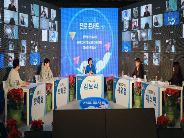 본 진로콘서트는 김보라 안성시장, 안성여자중학교 서유경 학생, 안법고등학교 채수연 학생, 인기웹툰작가 박태준을 패널로 초청하여 ‘포스트 코로나, 진로를 말하다’라는 주제를 가지고 함께 고민해보는 시간을 가졌으며, 대면-비대면 방청객 모두 활발하게 소통할 수 있는 환경을 구축하여 단순 방청이 아닌 참여자 모두가 만들어가는 의미 있는 자리였다.