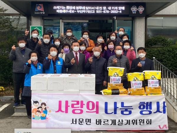 [KNT한국뉴스타임] 안성시 서운면 바르게살기위원회(위원장 김학성)는 지난 20일 서운면사무소에서 어려운 이웃을 돕기 위한 ‘사랑의 나눔 행사’를 진행했다고 밝혔다.