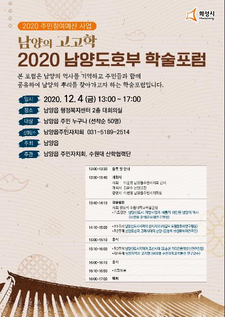 [KNT한국뉴스타임] 화성시 남양읍이 ‘남양의 고고학’을 주제로 내달 4일 ‘2020 남양도호부 학술포럼’을 개최한다.