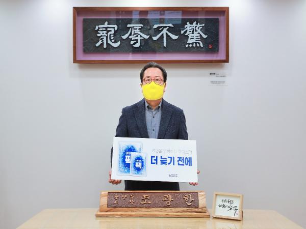 조 시장은 캠페인 다음 참여자로 참 좋은 지방정부 협의회 회장인 염태영 수원시장과 전국시장군수구청장 협의회 회장인 황명선 논산시장을 지목하고 함께 동참하여 줄 것을 부탁했다.