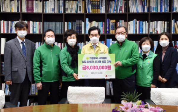 [KNT한국뉴스타임] 의정부시는 11월 24일 의정부시새마을회 자생단체 특화 뉴딜사업 참여자들이 십시일반 모은 성금 803만 원을 사회복지공동모금회에 기탁했다고 밝혔다.