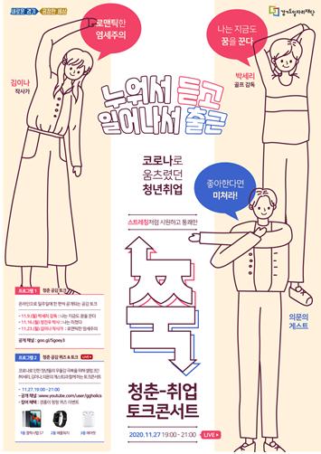 [KNT한국뉴스타임] 코로나 시대를 살아가는 청년들에게 새로운 비전과 희망을 제시하는 ‘2020 청춘취업 토크콘서트’가 오는 27일 저녁 온라인으로 생방송된다.