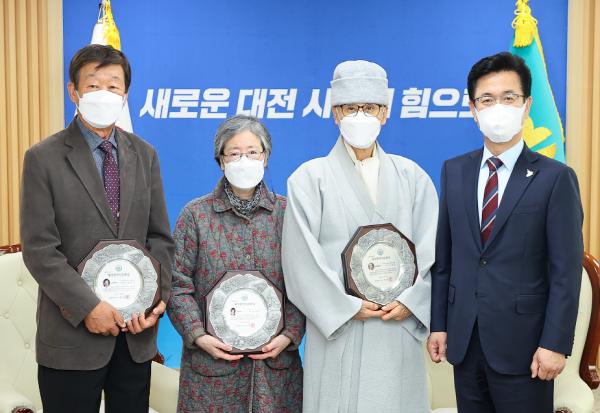 [KNT한국뉴스타임] 허태정 대전시장은 26일 오후 3시 시청 응접실에서 ‘제32회 대전광역시 문화상’ 수상자로 선정된 문학부문 양애경, 시각예술 부문 황용식, 공연예술 부문 송재섭 씨를 시상하고 그동안의 노고를 격려했다.