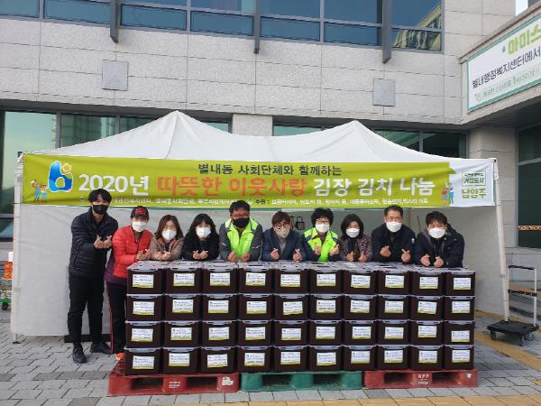 이번 김장 김치는 별내동 취약계층의 겨울나기를 위한 선물로, 별내동 소재 관내소상공인(보광타이어, 남도의 향, 장어의 꿈, 한승전기, 빅스타마트)들의 후원으로 1,980㎏(10㎏상당, 198상자)의 김장 김치가 마련되었다.
