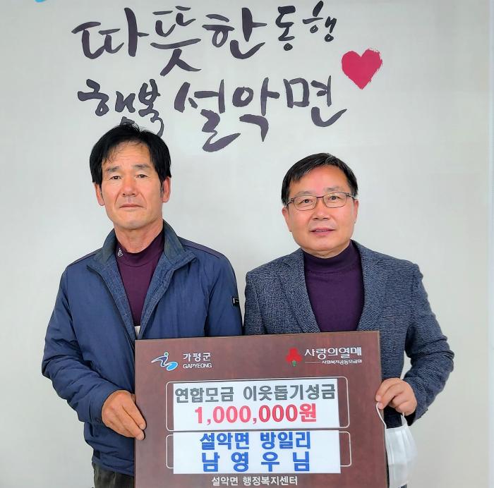 [한국뉴스타임=명기자 지난 23일 설악면 방일2리 거주하는 남영우 씨가 설악면행정복지센터를 방문하여 이웃돕기 성금 100만원을 기탁했다. 올해로 9년째 이어진 선행이다.