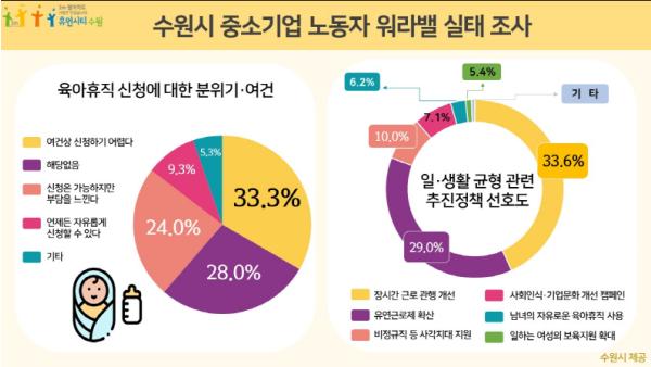 수원시와 수원시좋은시정위원회가 수원델타플렉스 입주 기업 재직 노동자 246명을 대상으로 한 설문조사에 따르면 응답자의 33.6%(1순위 선택)가 ‘워라밸’(일·생활 균형) 실현을 위해 우선 추진해야 할 정책으로 ‘장시간 근로 관행 개선’을 꼽았다.
