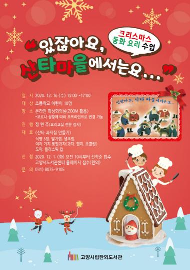 ‘크리스마스 동화요리 수업’은 초등학교 재학 중인 어린이라면 누구나 신청할 수 있다. 오는 12월 1일(화) 오전 10시부터 고양시 도서관센터 홈페이지(www.goyanglib.or.kr)나 전화((031-8075-9105)로 신청 가능하다. 온라인 화상회의 방식의 수업인 관계로 선착순 10명을 모집한다.