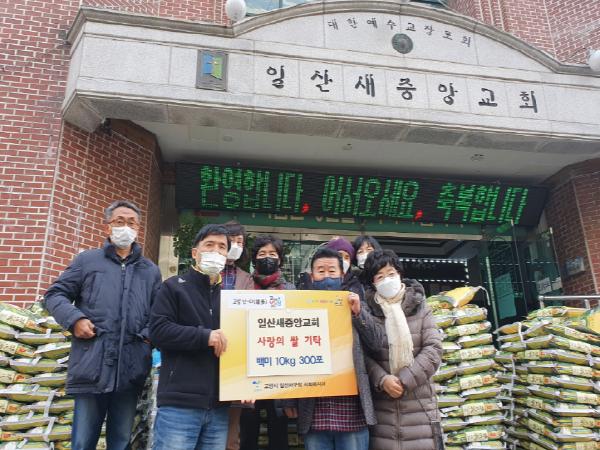일산새중앙교회는 일산서구 주엽동에 위치한 교회로 이웃 나눔을 실천하기 위해 소외계층을 대상으로 21년째 쌀 나눔을 진행해왔으며, 올해 코로나19로 어려운 상황에도 불구하고 ‘사랑의 쌀’ 10kg 300포를 기탁했다. 또한 10kg 200포를 추가로 마련해 교회 자체적으로 복지사각지대에 계신 분들을 찾아 전달할 계획이다.