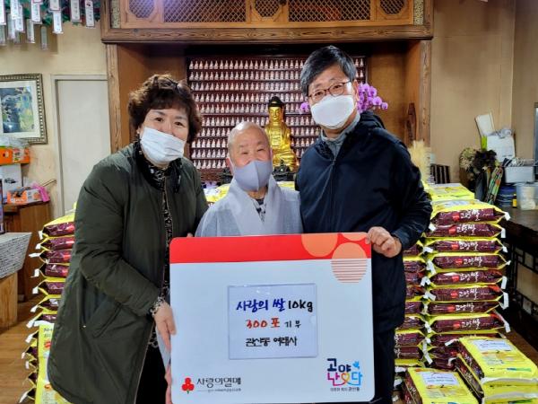 양지영 관산동 맞춤형복지팀장은 “주지스님의 이웃사랑 정신은 모두가 깊이 새겨야 할 참된 배움”이라고 답하면서 “모두가 어려운 상황 속에서 후원해 주신 양곡은 도움이 필요한 어려운 가정에 잘 전달될 수 있도록 최선을 다하겠다”고 말했다.