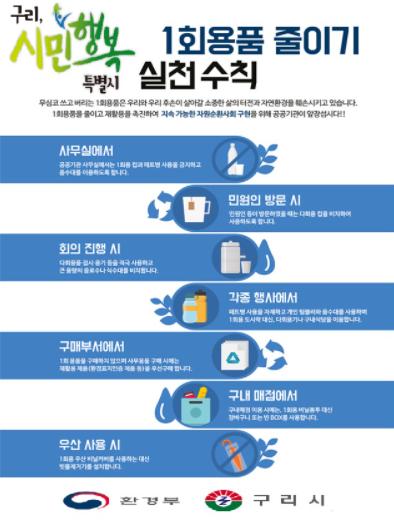 [KNT한국뉴스타임] 구리시는 12월 1일부터 그린뉴딜 정책의 일환으로 시 본청, 사업소, 각동, 산하기관의 모든 사무실에 1회용품 사용을 금지 및 시 주관 각종 행사와 회의 시에도 1회용품 사용을 최대한 제한하겠다고 밝혔다.