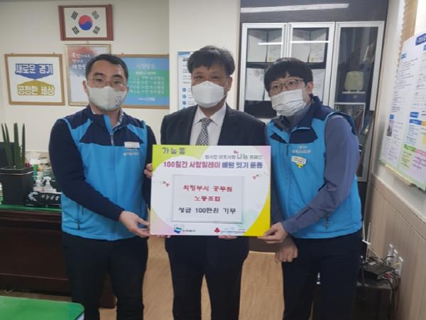 [KNT한국뉴스타임] 의정부시공무원노동조합은 12월 1일 ‘100일간 사랑 릴레이 운동’에 동참하기 위해 가능동주민센터에 성금 100만 원을 기부했다.