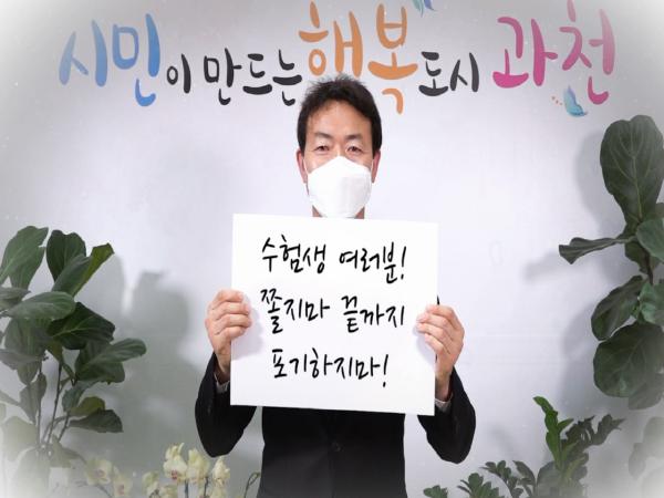 김종천 과천시장은 “올해 수험생들은 코로나19로 더욱 힘들고 어려운 시간을 보내왔다. 부모님들께서도 수험생들 뒷바라지에 고생 많으셨다. 이제 열심히 한 만큼 자신을 믿고 차분하고 당당하게 도전하길 바란다”며 응원의 메시지를 전했다.