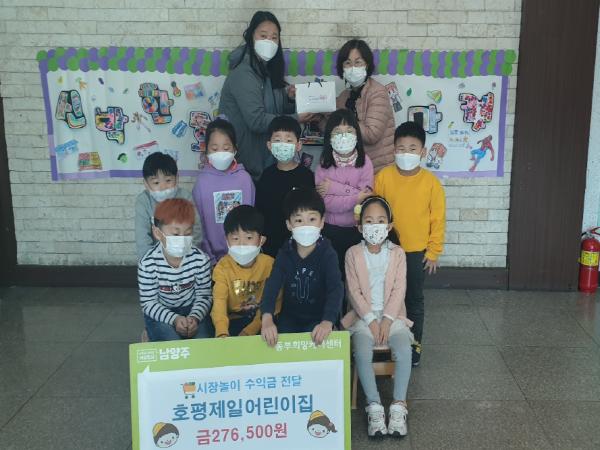 [KNT한국뉴스타임] 남양주시 호평동에 위치한 호평제일어린이집(원장 김귀순)은 원내에서 진행한 프리마켓 수익금 276,500원을 남양주시 동부희망케어센터에 의뢰하여 사회복지공동모금회에 기탁했다고 2일 전했다.