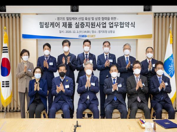 이재명 경기도지사, 윤화섭 안산시장, 박윤국 포천시장, 김기준 경기도경제과학진흥원장, 진석범 경기복지재단 대표이사, 이화순 경기도사회서비스원장, 한균태 경희대학교 총장, 김난희 고려대학교 안산병원 연구부원장, 차의과학대학교 이상조 연구부총장 등 9개 기관?단체장 등은 2일 경기도청에서 ‘힐링케어 제품 및 서비스에 대한 데이터 기반 실증지원 플랫폼 구축’ 사업착수보고 및 업무협약식을 갖고 경기도 힐링케어 산업 생태계 활성화와 건강한 지역사회 구현을 위해 상호협력하기로 했다. 협약식에는 경기도의회 최종현?김현삼?이원웅 의원도 참석했다.
