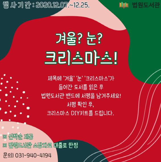이번 프로그램은 도서명에 ‘겨울’, ‘눈’, ‘크리스마스’가 포함된 도서를 대출해 법원도서관 밴드에 서평을 남긴 후, 어울림자료실1에서 크리스마스 DIY 키트를 수령해 들기 활동을 한다. 코로나19로 인해 사회적 거리두기가 장기화되는 만큼 만들기 활동은 각자의 개인별 공간에서 진행되며 행사 참여 후에는 서평을 남기면 된다.