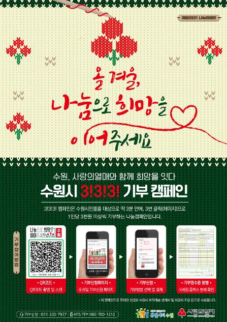 올해는 비대면 방식의 모바일 기부 캠페인도 병행한다. 수원시는 ‘수원시 3! 3! 3! 모바일 기부 캠페인’을 마련해 시민 누구나 큐알(QR)코드를 스캔해 3분 안에, 3번 클릭으로(페이지), 3천 원씩을 기부하는 방식으로 기부에 참여할 수 있다.