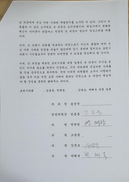 이에, 손 의장을 제외한 포천시의회 의원 일동은 손 의장이 지난날 본인이 저지른 과오를 깨끗이 인정하고, 만약 시민 여러분께 진심어린 사과를 할 것을 공개적으로 촉구한다. 만약 이러한 의원들의 요구가 이행되지 않을 경우 이로 인한 모든 사태의 결과는 전적으로 손 의장이 책임져야 할 것임을 분명히 밝혀두는 바이다.