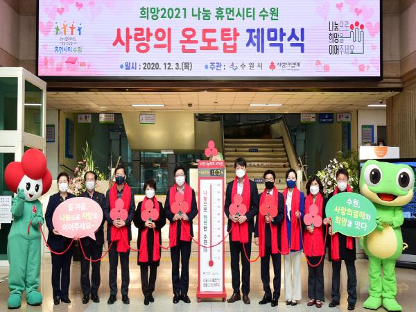 수원시는 3일 오후 1시20분 시청 본관 로비에서 ‘사랑의 온도탑’ 제막식을 열고, 앞으로 2개월간 진행될 ‘희망 2021 나눔 캠페인’의 시작을 알렸다.