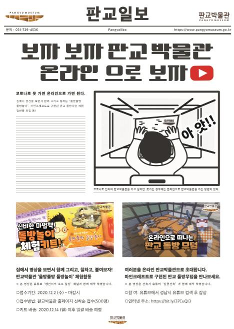 [KNT한국뉴스타임] 성남시 판교박물관은 코로나19로 박물관 대면 교육이 어려워짐에 따라 유아 및 초등학생 대상으로 온라인 교육 프로그램을 운영한다고 밝혔다.
