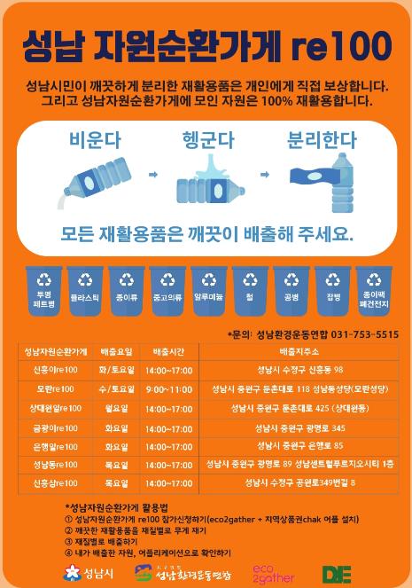 [KNT한국뉴스타임] 성남시는 전국 최초로 재활용이 가능한 쓰레기를 가져오면 현금이나 지역화폐로 보상해주는 ‘자원순환가게 re100(recycling 100%)을 2021년까지 10개소로 확대할 예정이라고 밝혔다.