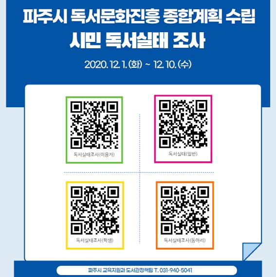 조사기간은 오는 15일까지며 코로나19 확산 예방을 위해 QR코드를 이용한 온라인 비대면조사로 진행한다. QR코드는 파주시 홈페이지, 파주시도서관 홈페이지를 통해서 접속할 수 있다. 네이버앱에서 ‘렌즈’ 클릭 후 ‘QR/바코드’ 선택 후 해당 QR코드를 화면에 인식해 실태조사 사이트로 이동한 뒤 설문조사를 진행하면 된다.