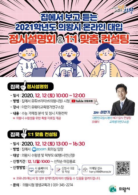 [KNT한국뉴스타임] 의왕시는 오는 12일 오전 10시에 집에서 보고 듣는 ‘2021학년도 온라인 대입 정시설명회 및 1:1 맞춤컨설팅’을 개최한다고 4일 밝혔다.