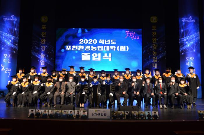 [한국뉴스타임=명기자] 지난 4일 2020학년도 포천환경농업대학․대학원 졸업식이 포천반월아트홀 대극장에서 개최되었다. 포천시 농업기술센터는 2005년 개교한 이래, 오늘까지 1,147명의 우수한 졸업생을 배출하였고 올해 졸업의 영광을 맞이한 106명의 졸업생 중 코로나19 거리두기로 인해 수상자 등 일부 인원이 졸업식에 참석하여 축하와 함께 졸업장을 수여받았다.