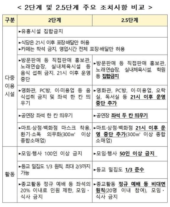 정부와 방역 당국은 불필요한 모임을 중단하고 가급적 집에만 머물 것을 권고했다. 거리두기 2.5단계는 방문판매 등 직접판매홍보관과 노래방, 실내스탠딩 공연장 등의 영업이 중단된다. 식당과 커피숍, 카페 등에 대한 조치는 2단계와 같다.