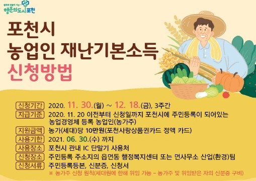지급대상은 재난기본소득 공고일(2020. 11. 20) 이전부터 신청일까지 포천시에 주소를 두고 농업경영체에 등록된 농가다.