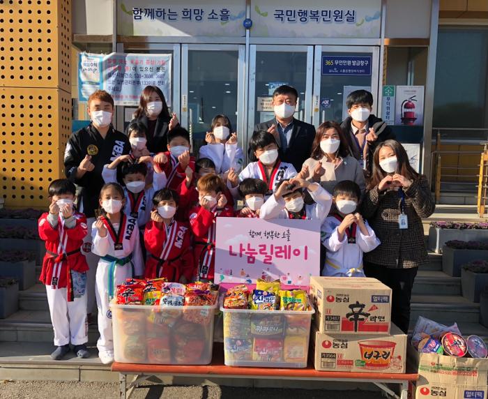 최기진 소흘읍장은 “본격적인 추위가 예상되는 시기에 소외된 이웃들이 따뜻한 겨울나기가 될 수 있도록 힘을 보태준 차오름태권도 학원에 감사드린다. 아이들의 정성어린 손길로 모아 온 후원물품 이라서 더욱 소중하다. 어린이들의 마음이 잘 전해질 수 있도록 잘 전달하겠다.”고 말했다.