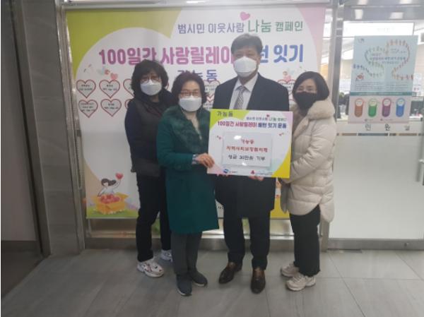 [KNT한국뉴스타임] 의정부시 가능동 지역사회보장협의체는 100일간 사랑릴레이 배턴잇기 운동에 참여하고 싶다며 12월 4일 가능동주민센터에 방문하여 성금 30만 원을 전달했다.
