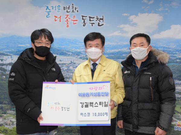 [KNT한국뉴스타임] 동두천시는 주식회사 강길텍스타일에서 7일 동두천시자원봉사센터에 마스크 1만장을 전달했다고 밝혔다.