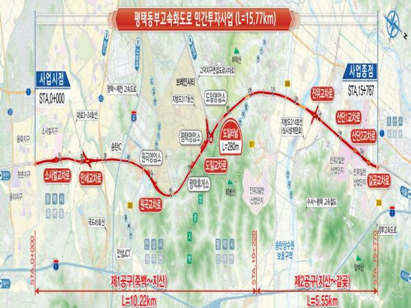 평택 동부고속화도로는 평택시 죽백동과 오산시 갈곶동까지 약 15.77㎞를 연결하는 왕복 4~6차로의 자동차전용도로로 민간사업자와 LH에서 사업비 전액을 부담해 평택시의 재정부담 없이 추진된다.