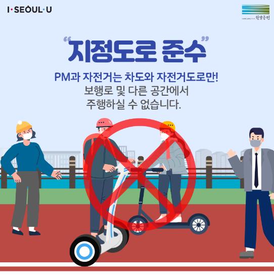 한강사업본부는 2015년 10월부터「서울특별시 한강공원 보전 및 이용에 관한 기본조례」에 따라 “바퀴가 있는 동력장치를 이용하여 차도 외의 장소에 출입하는 행위”를 지속적으로 단속해왔으며, 이에 따라 지정도로(차도·자전거도로) 외 장소에서 PM을 운행하는 경우도 금지행위로 규정하고 과태료(5만원)를 부과할 계획이다.