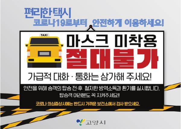 이에 고양시는 타 지역으로 출?퇴근 하는 시민 등 대중교통을 이용하는 시민들에게 경각심 갖도록 유도하고 마스크 필수 착용 등 보다 엄격한 방역지침 준수를 안내하기 위해 ‘대중교통 방역지침 준수’ 홍보 스티커를 제작해, 지난 8일부터 버스, 택시 등 관내 모든 대중교통 차량에 배부했다.