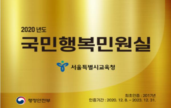 [KNT한국뉴스타임] 서울특별시교육청은 전국 17개 시·도교육청 최초로 행정안전부에서 주관하는 2020년 국민행복민원실 재인증기관으로 선정되었다.