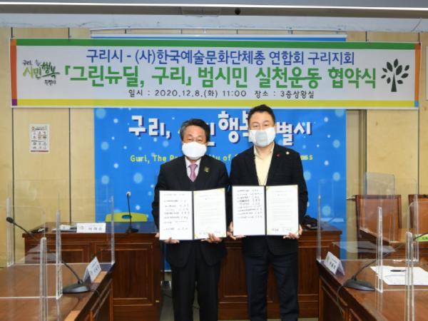 [KNT한국뉴스타임] 구리시는 12월 8일 오전 11시에 시청 3층 상황실에서 ㈔한국예술문화단체 총연합회 구리지회와의 '그린뉴딜, 구리' 협약식을 가졌다.