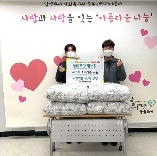 [KNT한국뉴스타임] 알레르망 남양주별내점(대표 최재원)은 지난 8일 저소득 어르신의 따뜻한 겨울나기를 위한 이불 20채를 북부희망케어센터(센터장 대행 김희정)에 기탁했다.