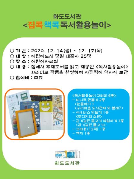 한편, 화도도서관에서는 코로나19 확산으로 도서대출반납만 가능한 상황에서 성장하는 아이들의 창의력 발달과 독서생활화의 밑거름이 되도록 집에서 체험가능한 문화행사를 꾸준히 실시하고 있다.